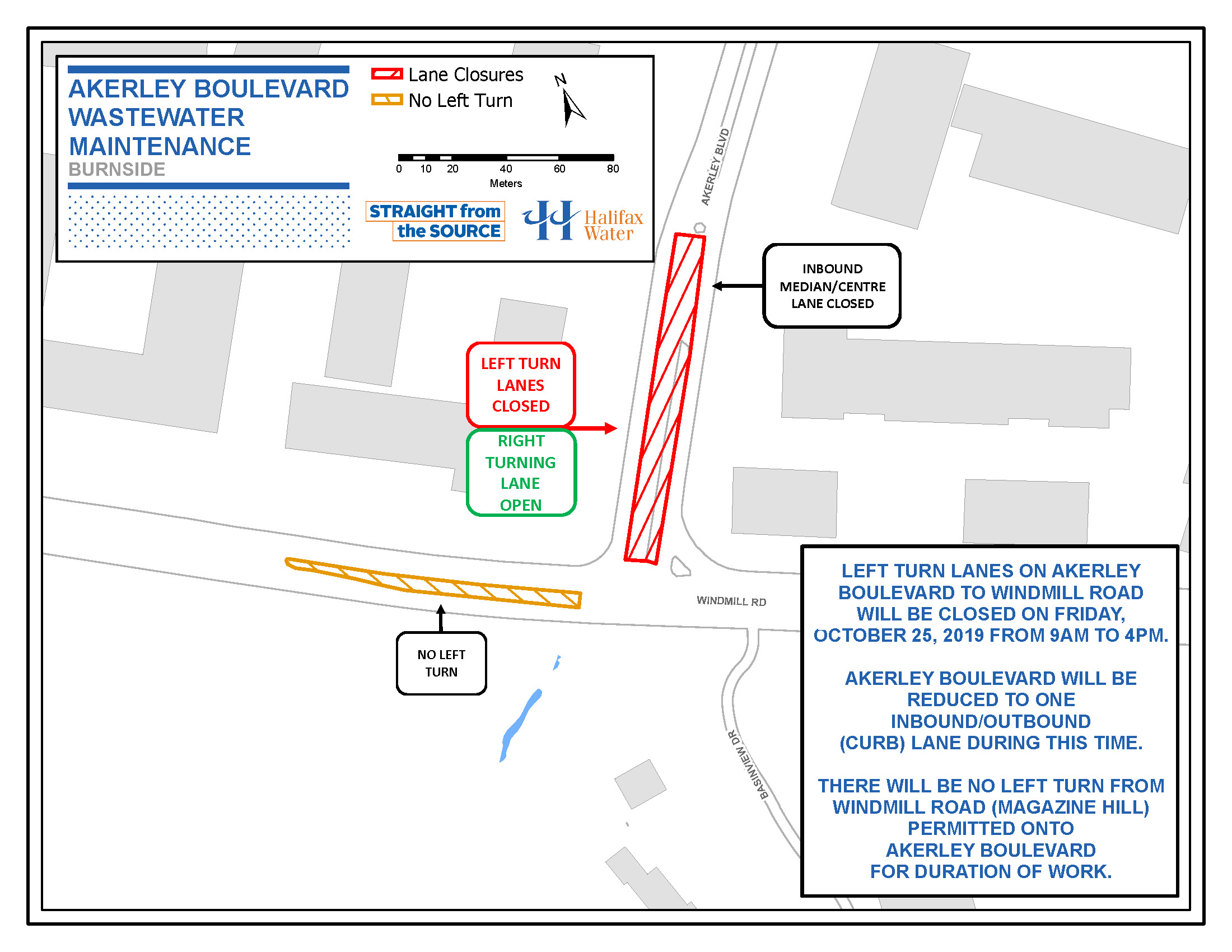 Attention motorists, cyclists and pedestrians, Halifax Water crews will be undertaking wastewater (sewer) system maintenance on Akerley Boulevard near the intersection of Windmill Road tomorrow (Friday, October 25, 2019).