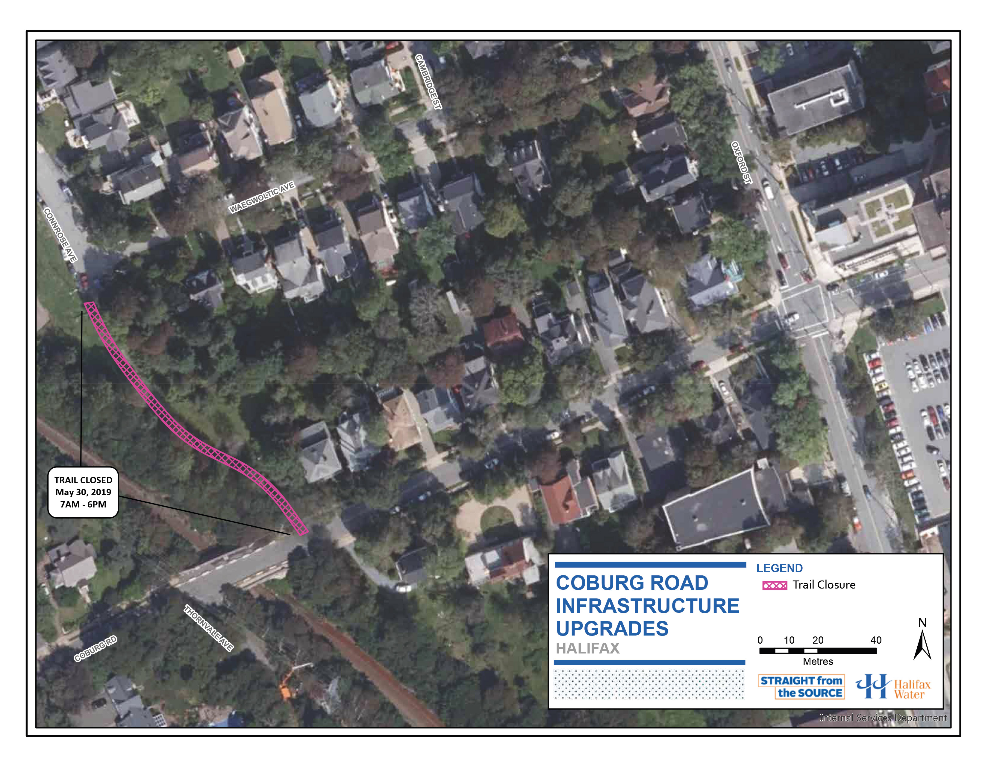As part of ongoing water and wastewater (sewer) system upgrades on Oxford Street and Coburg Road, Dexter Construction, on behalf of Halifax Water will require a one day closure of the trail between Connrose Avenue and Coburg Road tomorrow (Thursday, May 30th).