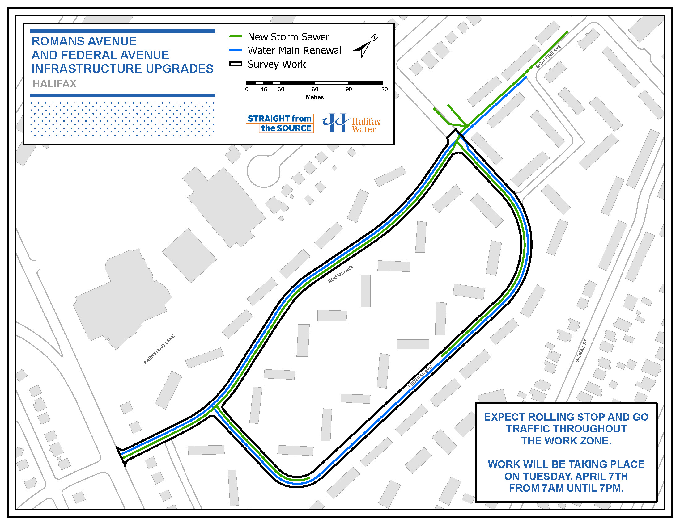 Halifax Water will be upgrading infrastructure on Federal Avenue, Romans Avenue and McAlpine Avenue. Halifax Water’s work will include the installation of new water main and storm sewer. In advance of this work, Dexter Construction will be conducting survey work tomorrow (Tuesday, April 7th).