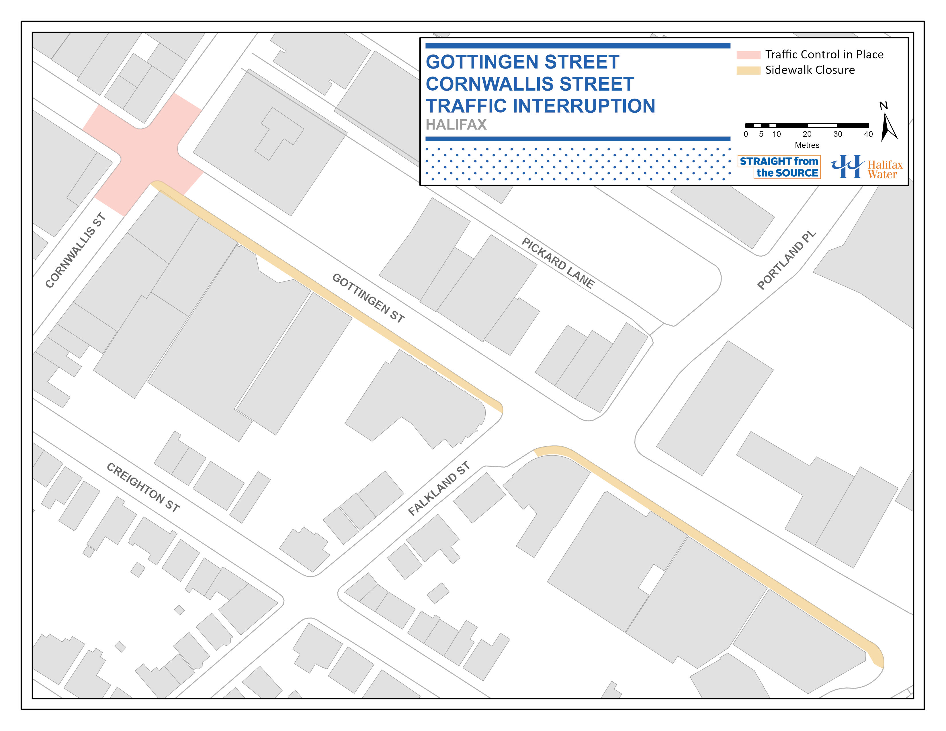 - There will be stop-and-go traffic through the intersection of Gottingen Street and Cornwallis Street. Experienced traffic control personnel will be on-site to manage traffic flows.