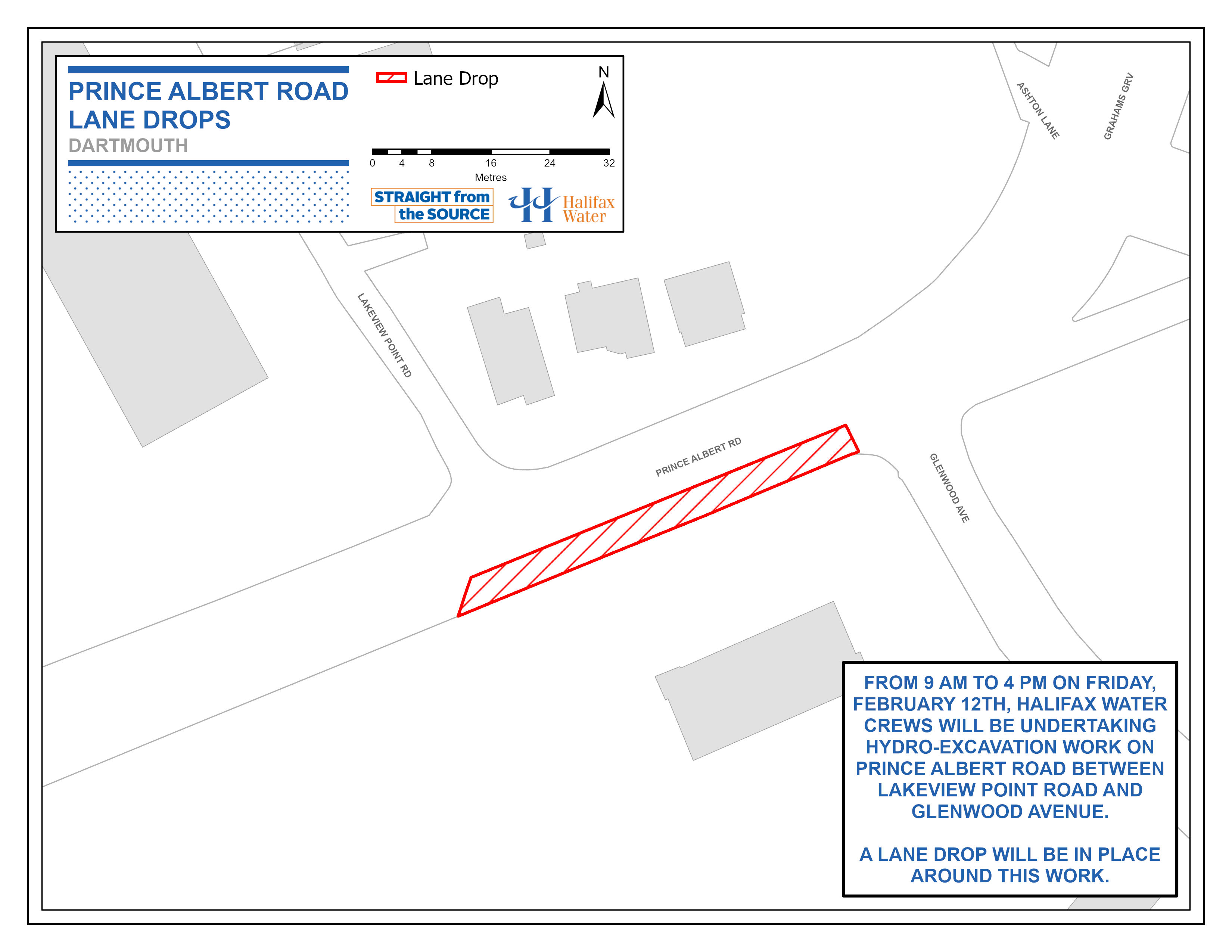From 9:00 AM to 4:00 PM on Friday, February 12, Halifax Water crews will be undertaking hydro-excavation work on Prince Albert Road between Lakeview Point Road and Glenwood Avenue.