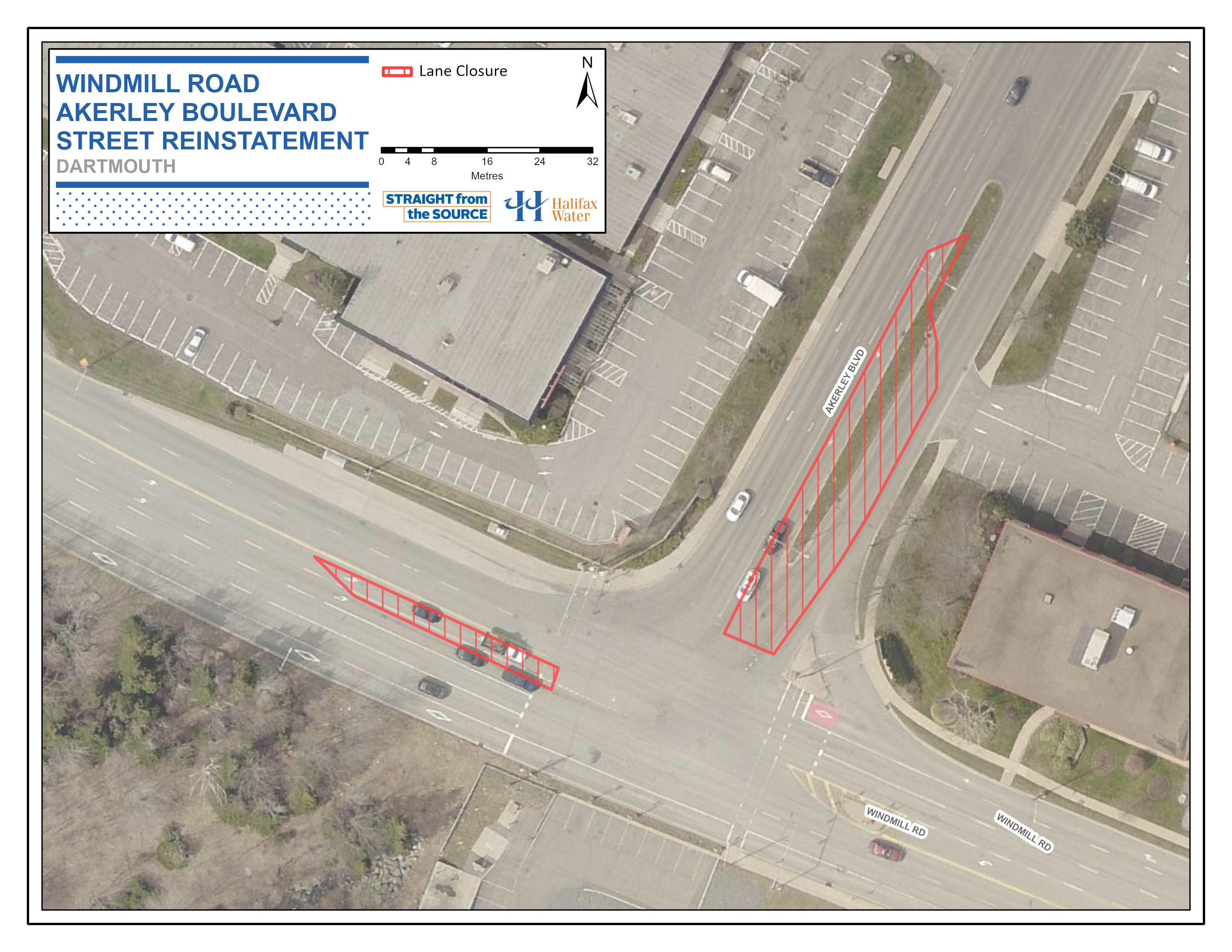 From 9:00 AM to 4:00 PM on June 1 & 2, Halifax Water crews will be undertaking street reinstatement work near the intersection of Windmill Road and Akerley Boulevard, Dartmouth. See attached map for related traffic impacts.