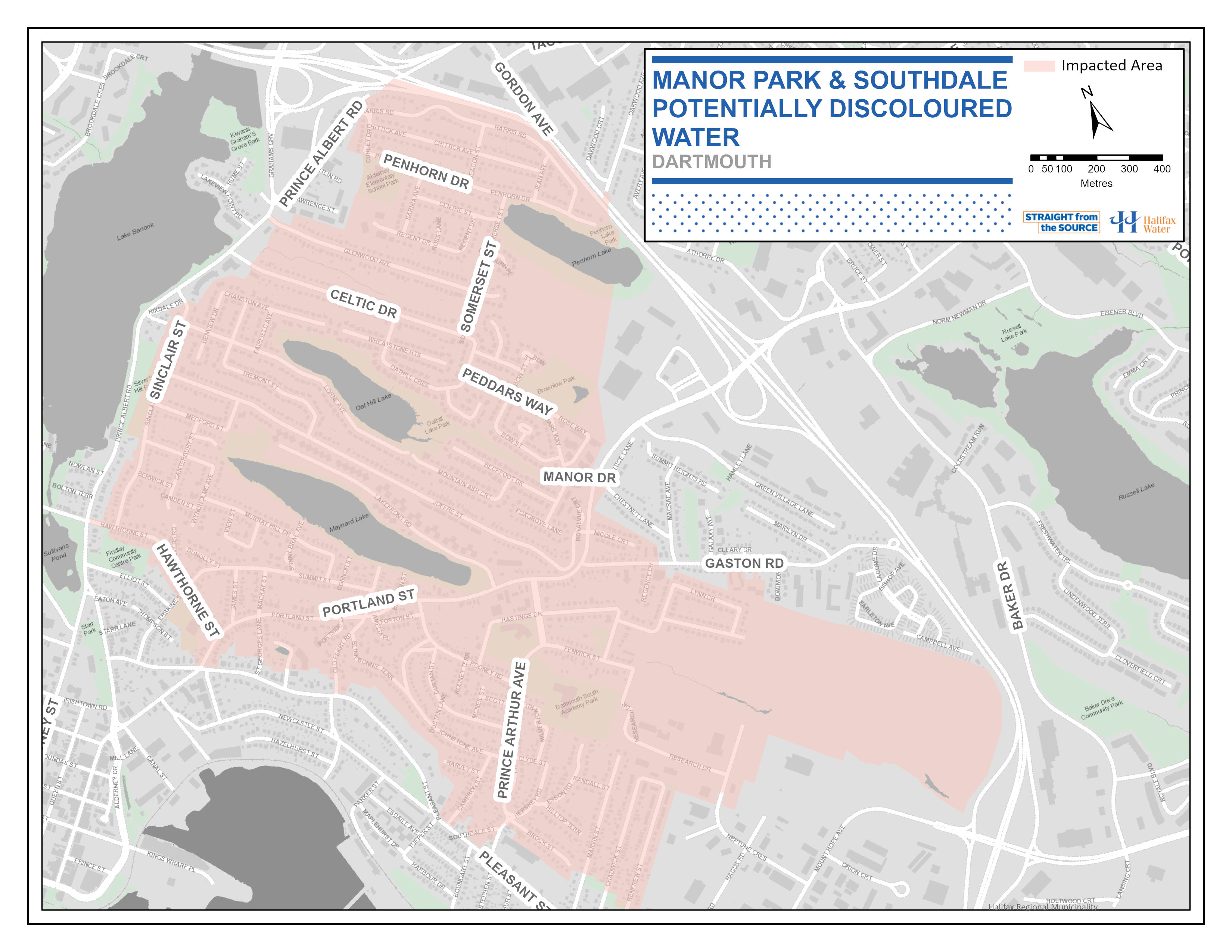 From 6:00 PM on Thursday, August 25 to 4:00 PM on Friday, August 26, customers in the Manor Park and Southdale areas of Dartmouth (see attached map) may experience temporarily discoloured water.