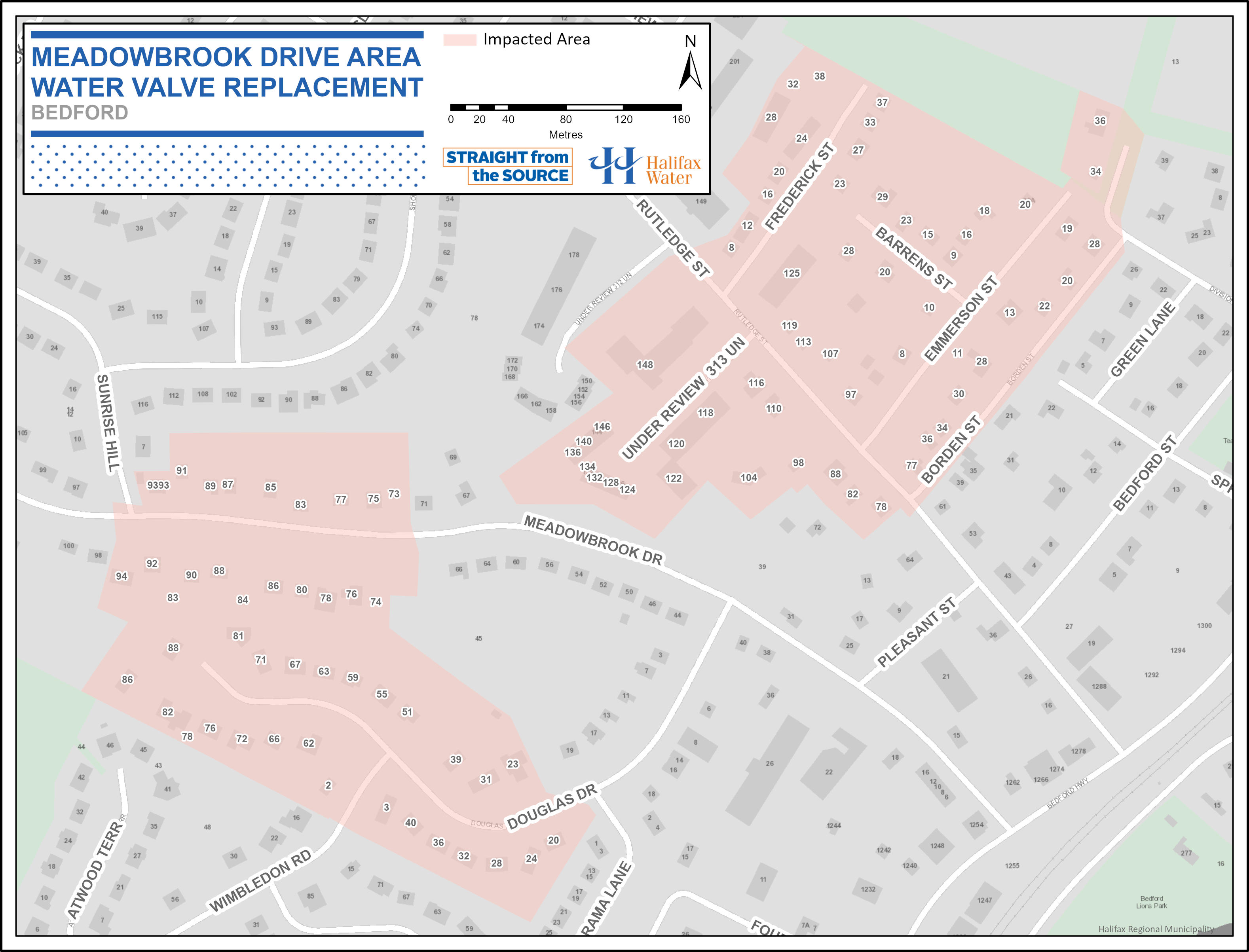 Halifax Water crews are on-site undertaking a water valve replacement on Meadowbrook Drive, Bedford. From midnight to 6:00 AM on Friday, October 21, water service will be temporarily shut down in the area shown.