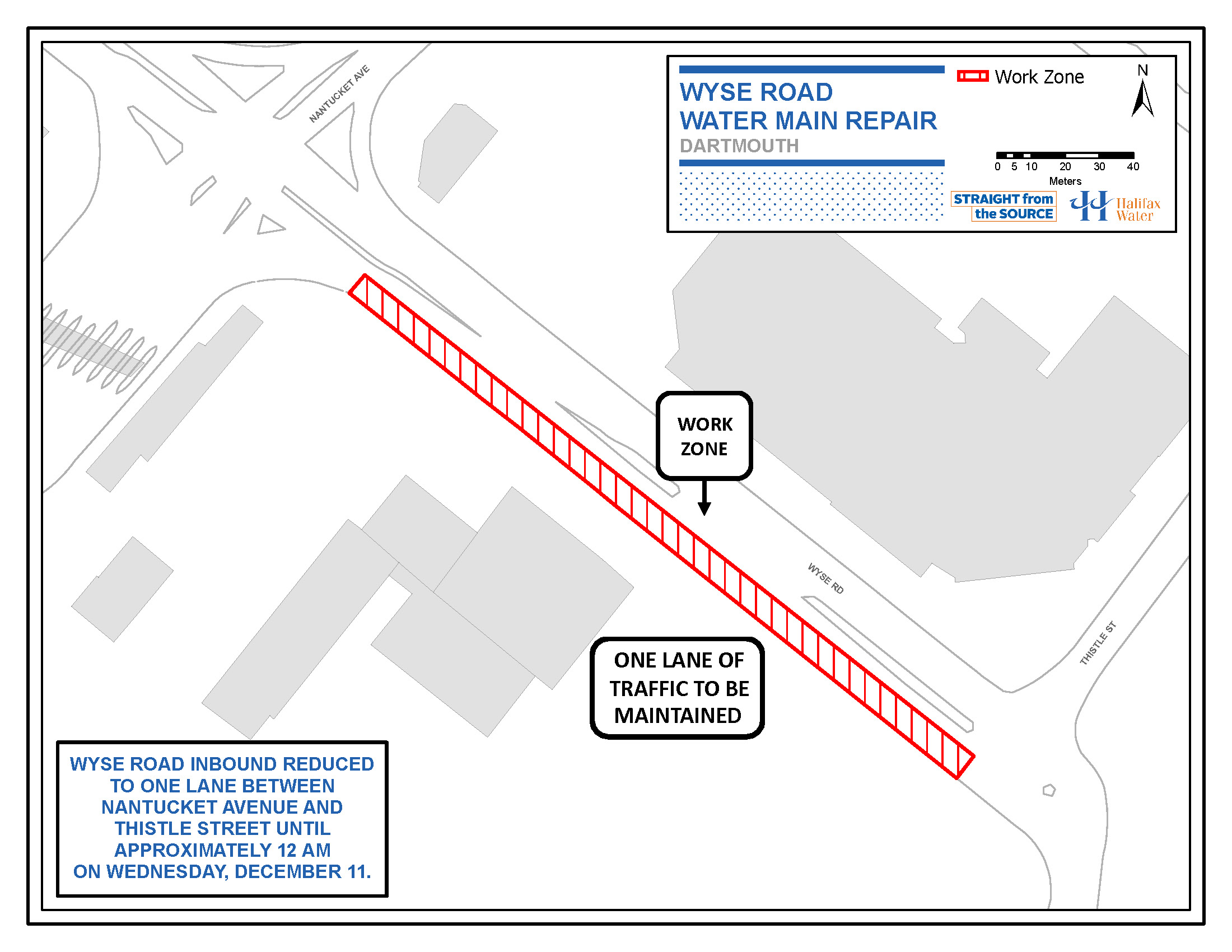 Wyse Road is reduced to one lane of inbound (toward downtown Dartmouth) traffic between Nantucket Avenue and Thistle Street. See attached work zone map. Pedestrian access will be maintained. It is estimated water service will be restored at approximately 12 midnight tonight.