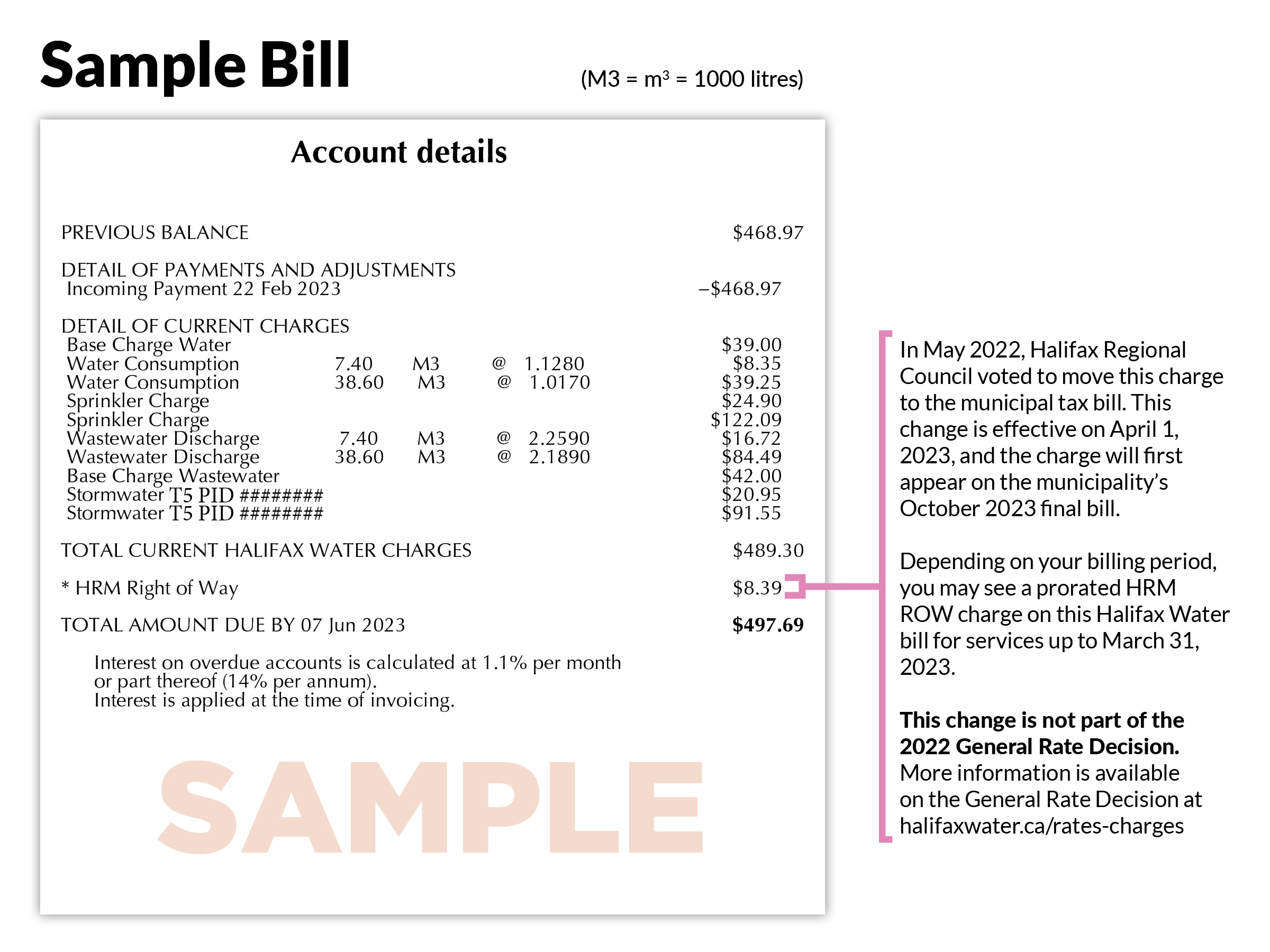 Halifax Water customers with a billing period that begins before April 1, 2023, will see a partial HRM ROW charge on their bill. In these cases, the HRM ROW charge will continue to be collected by Halifax Water for billing periods up to and including March 31, 2023. As a result, customers will receive a prorated amount of the HRM ROW charge on the bills they receive after March 31, 2023.